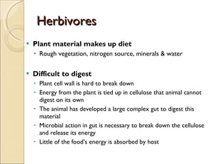 Theres a rich collection of microbes uh bacteria growing in your intestine. Um so this is your youre flora um composed of microbes That helps us digest cellulose and plant material. Once the plant materials are chewed special bacteria in the gut of an herbivore and the longer digestive tract break down the plant material.